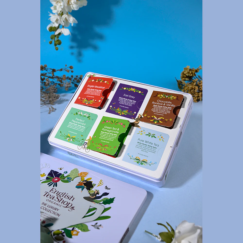 Delve into the finest selection of expertly blended organic teas, carefully crafted to elevate your tea-drinking experience. This luxurious gift tin offers an exquisite array of flavours, from classic favourites to exotic delights, perfect for you and your cherished ones.