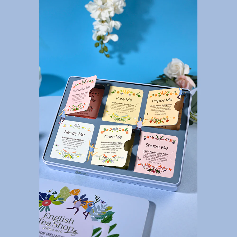Embark on a delightful journey of flavours with our 'Your Wellness Collection' Gift Tin. Explore a diverse range of organic tea blends meticulously crafted to elevate your wellbeing. From the comforting Beautiful Me to the invigorating Shape Me, savour the pleasure of exceptional teas designed to cater to your overall wellness.
